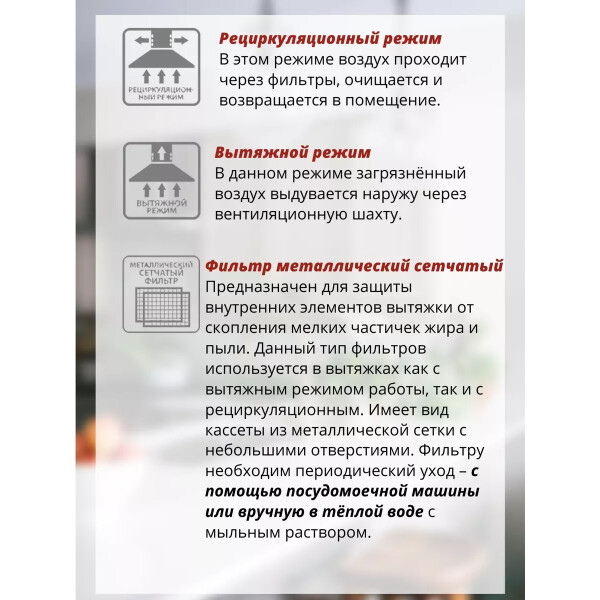 GEFEST ВО 2501 предназначена не только для отвода, но и для эффективной циркуляции воздуха в помещении. Поскольку фильтрующая система аппарата выполнена в виде двух фильтров (жирового и угольного), то модель будет перемещать исключительно предварительно очищенные потоки воздуха. Также конструкция прибора предусматривает наличие двух 25-ваттных ламп накаливания, которые создадут дополнительное освещение над варочной поверхностью. Всего в арсенале вытяжки три скорости работы двигателя.