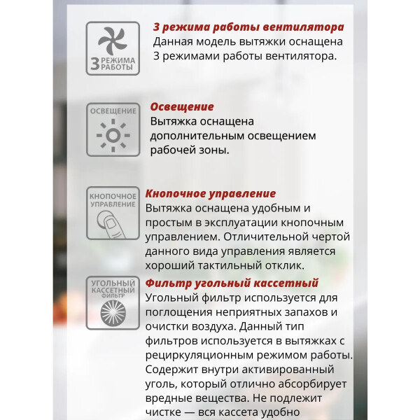 Практичная и простая в использовании вытяжка GEFEST ВО 2601 подвесного типа – это уникальное устройство, которое не допустит, чтобы гарь и жир, попадающие в воздушное пространство кухни в процессе приготовления пищи, оседали на мебели и стенах, делая их неэстетично желтыми и липкими. Для корректной установки прибора потребуется 60 см свободного пространства у стены, т. к. модель спроектирована для пристенной установки.