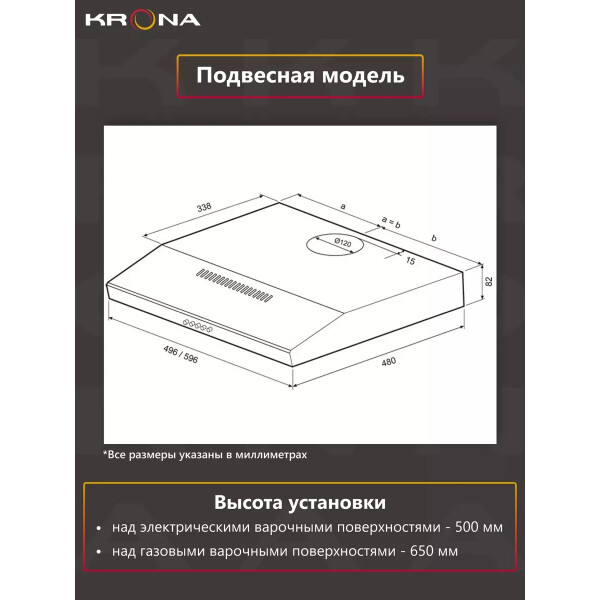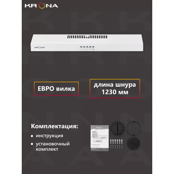 Подвесная вытяжка KRONA ERMINA порадует вас не только лаконичный дизайном, который идеально подойдет для любого кухонного интерьера, но и достойными характеристиками. Производительность вытяжки рассчитана для кухни до 7 кв.м.,а работает она практически бесшумно. Благодаря широкому выбору цветовых и размерных решений, эта модель отлично подойдет для любой кухни.
