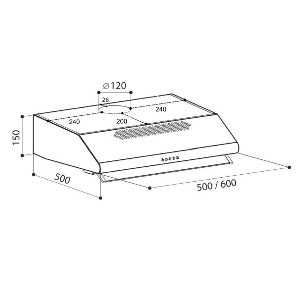 Основные характеристики. Установка подвесная. Размеры (ВхШхГ) 15х50х50 см. Ширина встраивания 50 см. Диаметр патрубка воздуховода 120 мм. Материал корпус: металл. Цвет корпус: серебристый. Потребляемая мощность 180 Вт. Количество двигателей 1. Функциональность, управление . Режимы работы отвод / циркуляция. Максимальная производительность 340 куб. м/ч. Количество скоростей 3. Управление механическое, кнопочное. Интенсивный режим нет. Освещение лампа накаливания, 40 Вт х 2. Особенности. Фильтр жировой. Максимальный уровень шума 52 дБ.