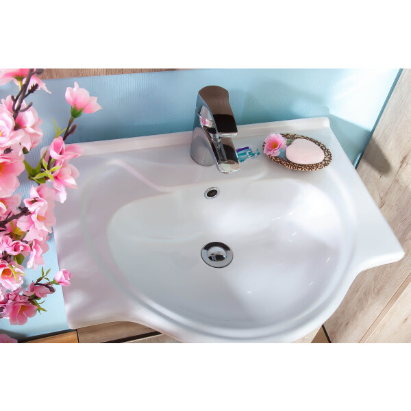 Зеркало выполнено в виде зеркального шкафа, за дверцей которого можно хранить косметические средства, шампуни и баночки с кремом.