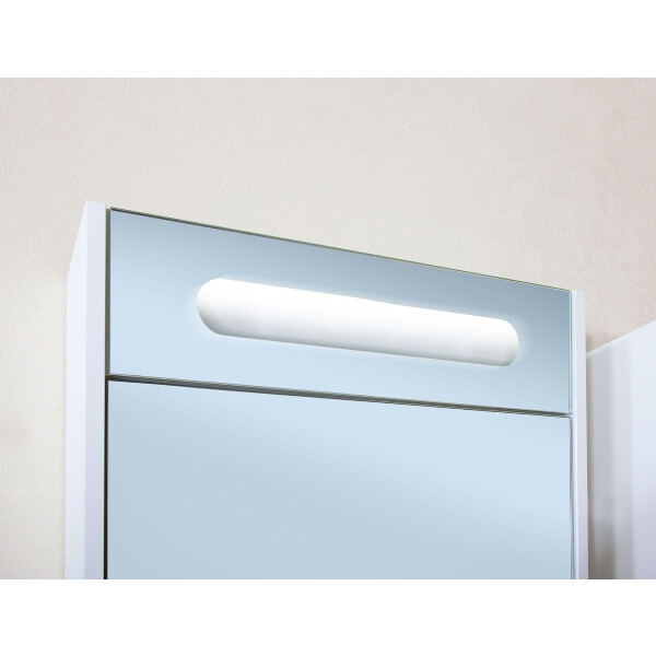 Зеркало "Палермо 55" выполнено в виде подвесного зеркального шкафчика, внутри которого за распашной дверцей расположено вместительное отделение с горизонтальной полкой, где можно разместить парфюмерные и косметические средства.