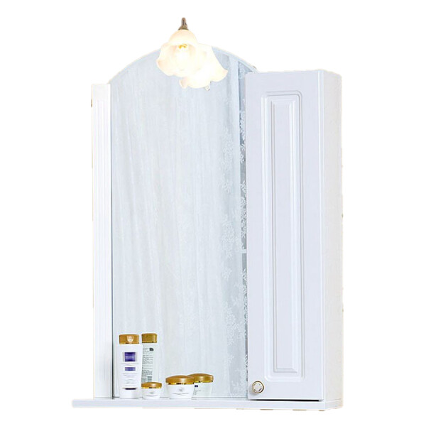 Сбоку к зеркалу крепится белоснежный шкафчик с элегантной фрезеровкой на дверке, украшенной фарфоровой ручкой. В нем вы сможете разместить все необходимые для ухода за кожей косметические средства, а на открытой полке, расположенной в самом низу изделия, можно расставить различные аксессуары, придающие пространству еще больший шарм.
