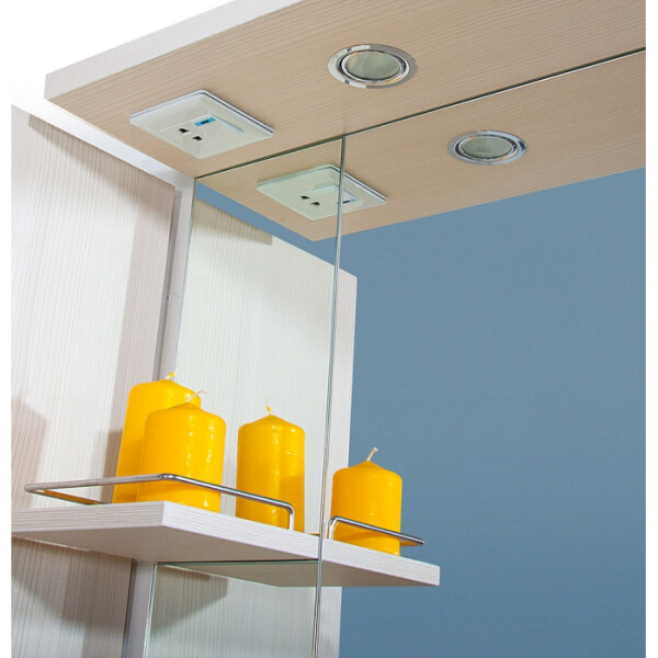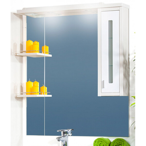 Зеркало имеет вместительный шкафчик, расположенный сбоку (справа), который открывается с помощью хромированной ручки. Витражи – высокопрочное матовое стекло. Зеркальное полотно покрыто серебряной амальгамой с водоотталкивающими свойствами.
