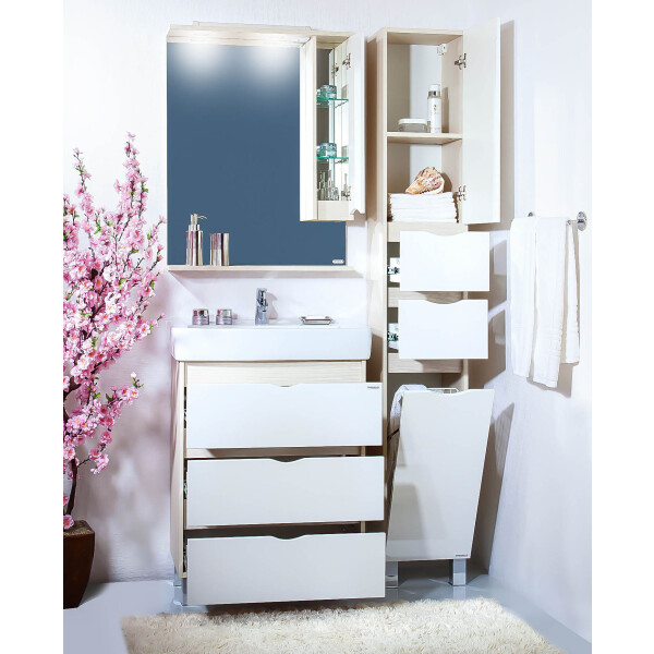 Зеркало для ванной "Токио 60 светлая лиственница/белый глянец" обладает выдержанным дизайном, классическим цветом и функциональными особенностями для создания особого комфорта в любом помещении. Оснащено небольшой полочкой для косметических средств и аксессуаров, двумя галогенными лампами в верхней части и небольшим шкафчиком для туалетных принадлежностей. Модель выполнена в японском стиле, который в настоящее время очень популярен среди дизайнеров.