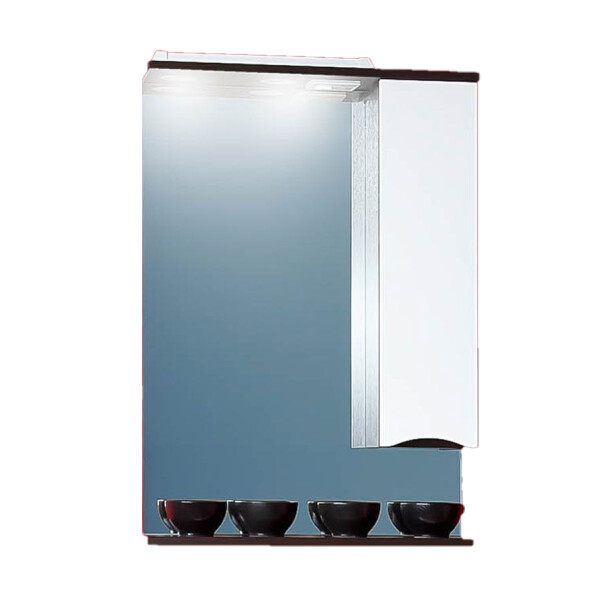 В нижней части зеркала располагается зеркальная полочка, которая позволяет размещать на ней декоративные аксессуары и флаконы с парфюмом. На верхней планке зеркальной полки находятся два галогеновых врезных светильника, создающие мягкий свет.